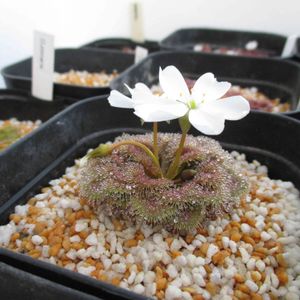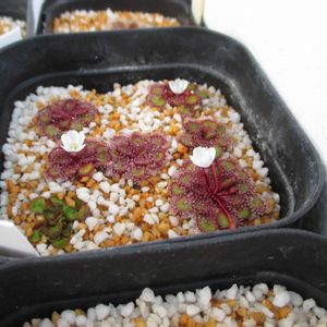 トロ箱の中で生育中の球根ドロセラ。マクロフィラが咲いてます!