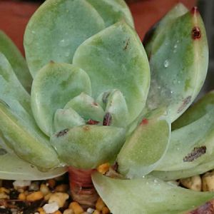 おはようございます☁ 雲間から時々陽がさしています☀ 今朝 タニパトしていたら 見つけてしまいました😢 ジュレている葉を取り除き お薬しておきました💦 他の子たちも心配になり エケベリアは全部お薬散布💊 大雨だったり 晴れて暑くなったりで 梅雨から夏は心配な季節です😣🥺 上手く夏越えしてくれたら良いのですが…😅