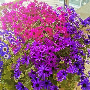コンビニの脇の広いスペースに鮮やかなサイネリアが咲いていました。 ここは、いつも、季節の花が置かれていて癒やされます。💜🩷💛