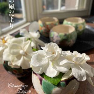 丘の風だより🌿 今季最後のクチナシ投稿🤭だいぶ飽きてもきたので、器にこだわることに✨我が家の逸品、5客・柄違いのお湯呑みに生けてみました。 最初それぞれに差してみましたが、うるさい💦 あーでもないこーでもないと触っているうちに、お花もくたくたに、、結局このような構図になりました😅