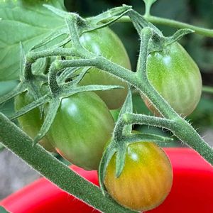 💠『家庭菜園ミニトマト』 家庭菜園なんて大きく出しましたが、 一鉢に一つの苗🌱です。恥ずかしい‼️ 大きくなって一個だけ少し色づいて来ています。😃 小さい実も数えたら25個ぐらい付いています。昨年より上出来です‼️嬉しい😊❣️ 因みに、昨年は5個の内2個鳥に食べられたようで、3個食べました😅💦
