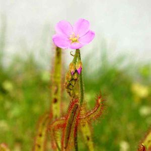 モウセンゴケの花が咲きました。 初夏になり、葉には小さい虫たちがたくさん捕らわれていますが、こんなに可愛い花が咲くんですよ。