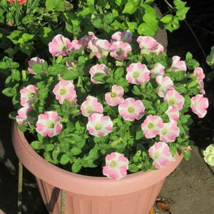 サフィニア ももいろハート❤ 4月中旬から1ヶ月間、花芽を全部摘んで、中央にちょこんとあった苗が鉢いっぱいになるまで大きくしました♫ 梅雨前に1回満開にしたくて咲かせてます🎶 やっぱりかわいいな〜❤ もっともりもりするよね(。•̀ᴗ-)و ̑̑✧
