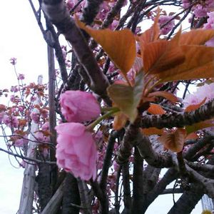 ソメイヨシノちり、八重桜咲き出す、つぼみは見た目は薔薇か、サザンカみたいだな、葉の色はまだ淡い色だ 八重桜はそのものがGSばえな花だな4/13撮影