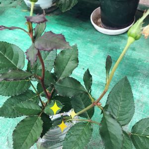 バラ*コティヨンですが、 生育が旺盛ですね。 キラキラマークつけたあたりで、ピンチしたのに(切り口が見えますでしょう?)、その下からも蕾を出したので、さらに下でカットしたという図です(^^;; ピンチするのが遅かったのかな。 カットした下からはまたすぐに芽吹いてきてます。 捨ててしまうのはもったいなくて、水に差していましたが、このまま咲いたりする?^ ^