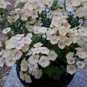 うちの玄関脇の寄せ植え こちらは、爽やかな白とクリーム色で ペチュニアさくらラテ植え込み時に 切り戻したら脇芽がたくさん出て 蕾もいっぱい奥にひそんでいます。 咲くのが楽しみ❣️