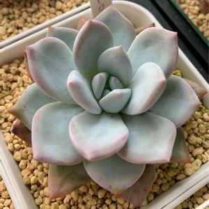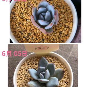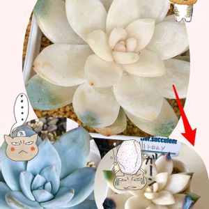 謎多きトロムソσ(∵`)? 真っ白で美しいわぁ✨と思っていたトロムソが実は高温障害であることを知った時のショック😱 障害でもパツパツで元気だからいいわと思っていた昨年の7月、見事にバーナーで炙ったみたいに葉先が焦げてしまいました😭💧 そこからダメージは徐々に広がり、外葉1周と中心の成長点のほんのゴマ粒みたいなミクロな葉を残すのみの残念なお姿に😔 もうそこで半ば死を覚悟しましたが、トロムソはしぶとかった👊 不撓不屈の精神で見事に復活を遂げましたが..................えっ、白くない😅 普通のお粉をまとった青い姿になりました。 あんた、誰ね?と言いたい感じの変貌ぶり! そして4月のリエールさんの多肉カーニバルで購入したトロムソも、これまた普通の青いお姿でした。 そうか、これが本来の健康なトロムソなのね😂 真っ白な時ってお粉もついていなくて、ツルツルの透明感がある白なんですよね。まるでカルピスみたいな白!牛乳の白じゃないのよ! 障害があるときの方が綺麗って罪だわ☹️
