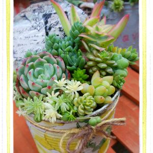 今日の寄せ植え✨ メモリアルセットのメンバーをお一人さま入れて寄せ植えしました。 黄緑&緑寄せにしようとしましたが、韓国苗が黄緑の子がパッカーン状態だったのでもう一人のコロンコロンを入れました💕 あとは、チマチマと小さな子達を回りに………(*´ω`*) 寄せ植えは楽しいですね~🍀