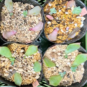 🏷毎月13日と14日は葉挿しの日 ↖️アリエル ↗️シムランスアセンション ⬇️水蜜桃 アリエルなかなか大きくならない💦 シムランスアセンションは葉挿し率良かったかも😊