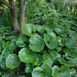 昨夜から雨と雷 止んだので庭へ 槙の木の根元の 石蕗 緑葉と大獅子の 緑が鮮やかです 株元に小さい蕾が 見え始めてます