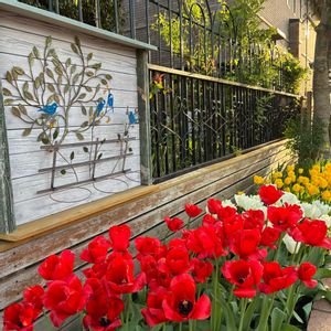 並んだ並んだ赤・白・黄色♪ お隣りのチューリップと芝桜、毎年綺麗で、楽しみです😊