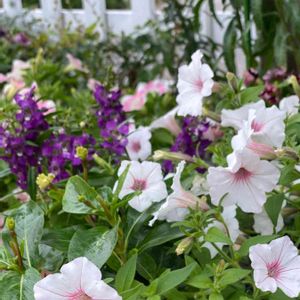 "ペチュニアスーパーチュニア ビスタシルバーベリー" なが〜いお名前覚えられない😅 あっちこっち向いてるけど、清楚で 可愛いです😍 後はパープルのアンゲロニア 暑さに強いそうです💕 シングルのお花は比較的、弱い雨なら大丈夫ですが、ゲリラ豪雨には耐えられるかな? 昨日のゲリラ豪雨、仕事で車運転中、前が全く見えず危険を感じてコンビニの駐車場借りて暫く避難していました💦 皆様もお気を付け下さいね。