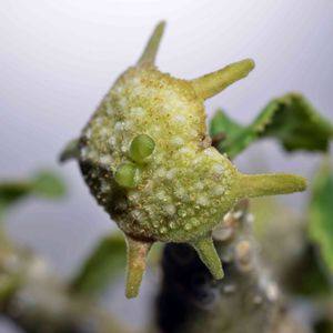 ドルステニア・sp.の奇妙な花。真ん中に二つ、プクリと膨れているのが自家受粉した種です。このあと種がはじけて飛んでいくのですが、我が家では種を巻き散らされる前に花をむしり取っています。