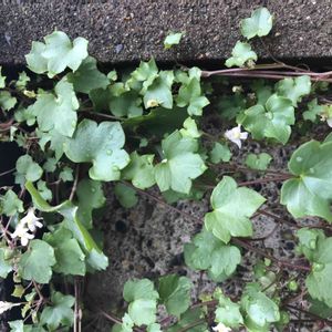 ブロック塀に垂直に張り付いています。ツタバウンランみたいな葉っぱですが、花が違うな、と。
