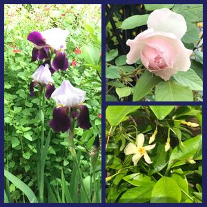 ⬅️ジャーマンアイリス開花❣️ ↗️クリスティアーナ🌹咲き始めたのに、明日から嵐☔️ ↘️定家カズラ 開花❣️羽衣ジャスミンとは、香りも少し違う😁
