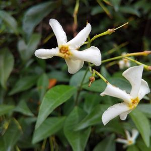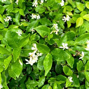 生け垣になったテイカカズラ。クチナシの花と花弁の数が違うのに,これまで恥ずかしながら,本種のことを「小さいクチナシの品種」だと勝手に思いこんでいました。