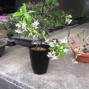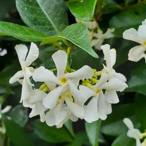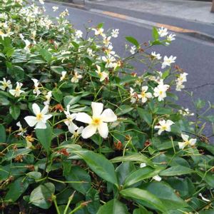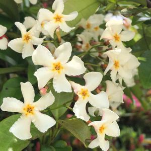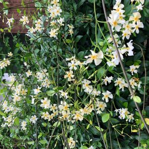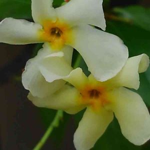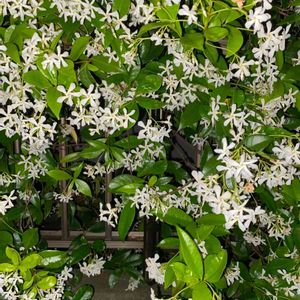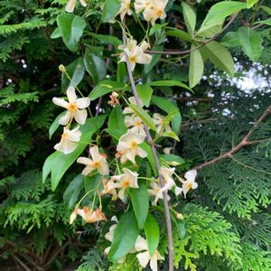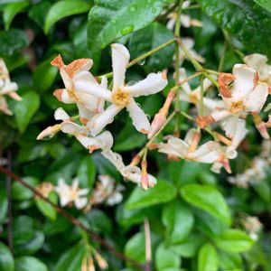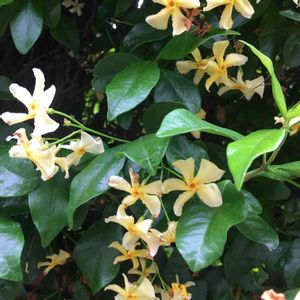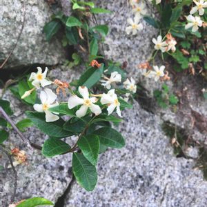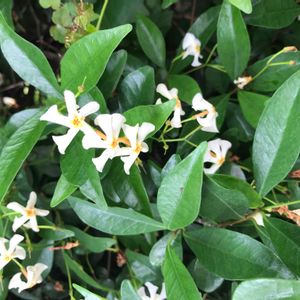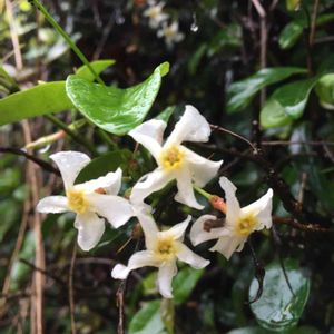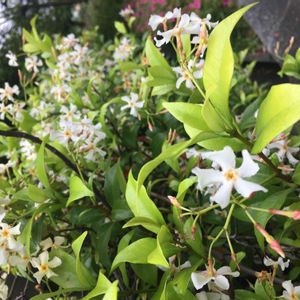 花期は5~6月 キョウチクトウ科の常緑つる性木本 花は枝先や葉腋に房状につく 花色は乳白色から、徐々に淡黄色に変化する 花は筒状の基部(筒部)と、先端が5裂し断片がねじれたプロペラ状の花冠から成る高杯形 ジャスミンの様な甘い芳香がある 葉は楕円形で光沢がある 葉や茎を切ると白い有毒の乳液が出るので注意⚠️ 果実は細長い円柱形の袋果 2個が対になってぶら下がる 熟すと縦に裂け、白く長い綿毛のある種が風に飛んでいく 藤原定家が慕った皇女の死後も彼女が忘れられず、蔦葛となって皇女の墓にまとわりついたという能「定家」が名前の由来