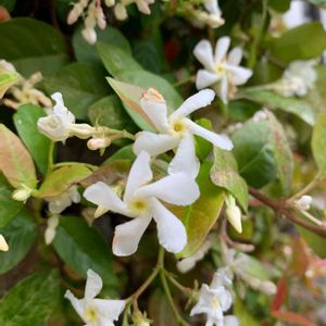 塀の上でヒラヒラ🦋蝶かと思ったら、季節外れの定家カズラが咲いてました😁 一瞬ハゴロモジャスミンかと思いましたが、定家カズラの蔓が1本侵入してました(笑) ホワイトプリンセスは四季咲きだけど、定家とハゴロモは一季咲きのはず🤔❓