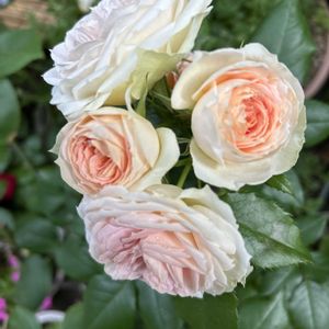 🥀クラリス…後半組のマーサ・エクリュに続き開花し始めてます╰(*´︶`*)╯♡ 比較的新しくお迎えした薔薇に比べると小振りの花で…より可愛らしく見えます🤭 小さいながらに杏色もほのかに色付き出して綺麗な姿で咲いていますが、今年は蕾は4個しかついていません(⌒-⌒; ) 🌿だけでも楽しめる綺麗な葉なので…オベリスクに巻きつけてコンパクトにつるバラのように夏場はワサワサにしてみたい…🤭 🏷️我が家のクラリス姫👸 備忘録までに…