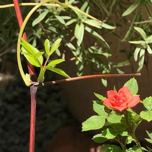 右は小さな小さなミニバラ、リトルマリー 。 たくさん咲いた後、葉が全て落ちました😵 その後、葉も展開しひとつだけ濃いオレンジの花が咲きました🧡 左は一番花の後、剪定した枝をぶっさりと無造作に挿しておいたクレマチス。 葉が展開してきました。 このままこの鉢で育ててしまおうか、、、😅
