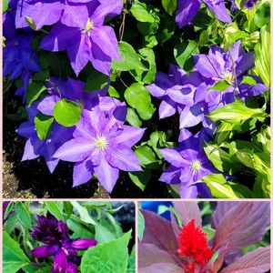 クレマチスのお花が増えていくのが嬉しい😃🎶 こんな深い紫のサルビアは初めてです💜 葉っぱまで赤いセロシア(ケイトウ)♥️ 葉っぱは赤紫蘇みたいです🤭 🏷️美しく青きドヨウ に参加させてください🤗