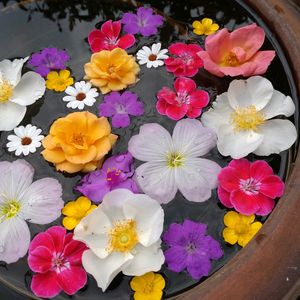 黄色のミニバラ🌹が綺麗に咲いたので、お庭のお花たちで、花手水を、睡蓮鉢につくってみました❤️🎶🎶😊