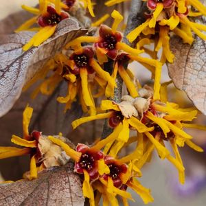 支那満作(シナマンサク) マンサク科マンサク属の落葉小高木。中国原産で庭木や鉢植え、公園樹にされる。日当たりのよい肥沃地に適する。葉は満作(マンサク)よりかなり大形。左右非対称で歪んでいる。鋸歯が目立たず葉の表面に軟毛、裏面に灰白色の毛が密生する。秋に黄葉し、開花時も枯れ葉が枝に残りやすい。花期は1~3月。花は黄金色で、葉の展開前に開花する。花弁と萼片はマンサクと同じ形だが、本種のほうがやや大きい。果実は蒴果。熟すと口が開き中の種子がのぞく。種子を包む黄色い皮(内果皮)が乾いて縮みはじめ、くるんと内側に巻き込む。その瞬間、種子は勢いよく発射される。 マンサクの仲間であり、中国から渡来したため『シナ』と『マンサク』を組み合わせてこの名前になった。マンサクの名前は、まだ雪の残っている山中に一番に咲く花なので『まず咲く』に由来するという説が江戸時代からいわれてきた。『まず咲く』が東北地方で『まんず咲く』に訛り、マンサクになったのではないかともいう。その他、枝いっぱいに花を咲かせる様子を『豊年満作』に例えたとの説もある。 出典『樹木 見分けのポイント図鑑』『原寸で楽しむ身近な木の実・タネ』『樹木の名前』