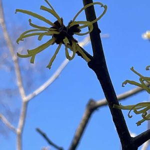 今日のお花 たぶんシナマンサクです シナマンサクの方が早く咲く、花弁が長い、花弁の基部がマンサクの紅褐色に対して暗褐色、前年の葉が残っていることが多い、葉っぱの毛がマンサクは無し、シナマンサクは有り、などの違いがあるようです 今年、葉っぱの確認ができるかな? 花が終わると忘れてしまいますよね