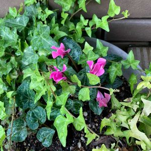 おはようございます♪ 元気なへデラの隙間からガーデンシクラメンが💕 え?今咲く?