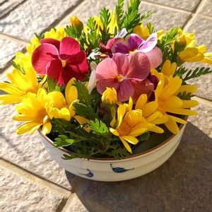 アレンジメント2回目💐 朝摘みしたパンジー、ビオラ、クリスマスローズを入れて😊 2枚目の赤い植物の名前、分かる方いますか🤔?