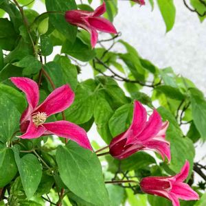 2年目のクレマチス プリンセスダイアナ💕 伸び伸びと自由に蔓を伸ばして ハナミズキに巻き付いて 咲いています😊 濃いピンクがグリーンに映えます✨