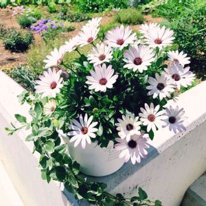 朝から快晴☀️暑い…💦 3月にアップしたオステオスペルマムアキラさん、切り戻し後にまた咲きだしました💠