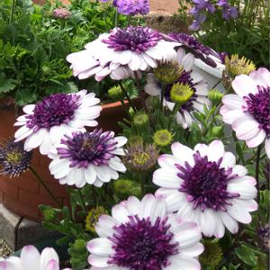 こんばんは🌟 ダブルオステオスペルマム 3年前お迎えした3種類のうち 1種類だけ生き残った親株さんからの 挿し芽株も次々に咲いています💜 親株さんはろくろ首のような茎から お花が咲いているので、見た目が ちょっと残念💦 梅雨前には剪定してあげないと😅