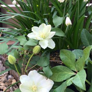 こんにちは☀️ 昨年11月に小苗でお迎えした クレマチス月宮殿が もう咲き出しました✨✨ ぷっくり蕾も可愛い😍 少し大きめ黒ポットに植わっているだけ なので、クリローの葉でごまかして いるつもり😅 まだ小さいのに咲かせて大丈夫かなー? 🔰💦