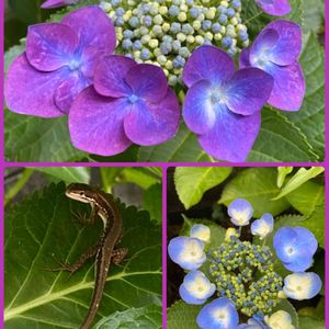 おはようございます☁️ 庭のガクアジサイが次々に咲いて賑やかになってきました💜*\(^o^)/*💜 今年は去年の倍以上の花付きです💠💠 紫陽花の葉っぱに可愛いお客様を発見👀 カナヘビでしょうか🦎