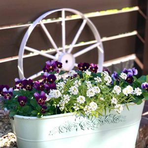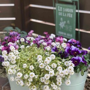 こんにちは☀️ ビオラとスーパーアリッサムの寄せ植え がモリモリに〜💜 スーパーアリッサムパワーに押されて ビオラちゃんが顔を出そうと必死です😅 ビオラももか ぶどう🍇3株ですが、 色幅があって面白いですね💜