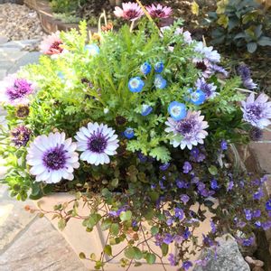 おはようございます😊 昨日の荒天が去り、やっと晴れました☀️ 朝から庭パトしてたら、寄せ植えが だいぶ咲いてきてました💖 ネモフィラさんが予想以上に伸びて、 ダブルオステオスペルマムさんが 負けそう💦 初めてお迎えしたベロニカオックスフォードブルーさんも次々開花💜