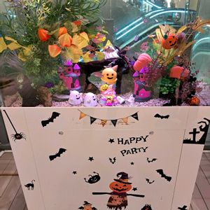 花散歩に行ったら 夏の花達はすっかり抜かれて花壇が秋に変わろうとしていました ショッピングセンター内ではハロウィン🎃飾りが 水中にホウズキが