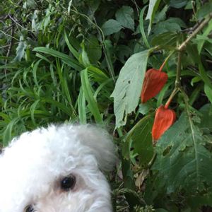 野ホウズキ見つけました🌱 ゴマちゃん強引に侵入🐶 直前に銀杏4個拾ってしまい😅 その手でパチっ✨ しまった😨 スマホくっさ〜😰