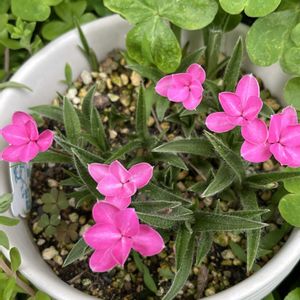 こんにちは ^ - ^ ♪ 風が すごいです🌪️ 🌪️ 🌪️ お花たち💬『 きゃーー 』です。 ① アルメリア バレリーナ ② サギナ ③ アッツザクラ ④ チェリーセージ いちごみるく ⑤ しろばないもかたばみ