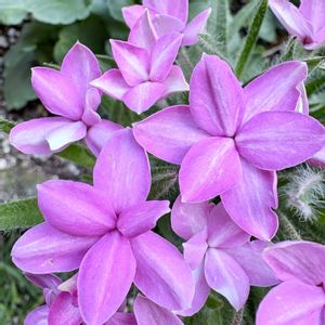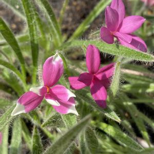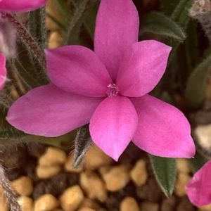 【アッツザクラ(アッツ桜、ロードヒポキシス)】 南アフリカ原産、キンバイザサ科多年草 桜の花びらが5枚なのに対し、アッツザクラの花びらは6枚。花の中心部に雄しべと雌しべが見えない。花びらが曲がっていて、中心部が奥まっているので中が見えないが、雄しべと雌しべは、花の中心部の奥に隠れるように存在する。 草丈:5~15cm、 開花期:4月~6月 花色:赤,ピンク,白 ガーデンマルシェ防府にて