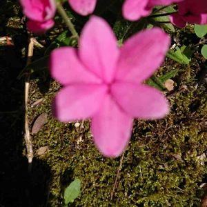 庭の苔地で毎年咲く”アッツザクラ”。真っ先に花開いた一輪、緑一面の中で際立っています(^_^)