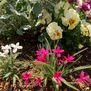初めてアッツザクラを購入! 白花と赤花があり、 先週植え付けました! 小さいお花がとっても可愛い😍 花壇の一番手前にちょこんと🌷 パンジーとの相性もよく、 球根なので来年も咲くのがいい!