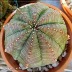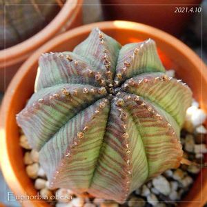 ユーフォルビア属仔吹きオベサ 前から欲しかった子吹きオベサ。いい形のがあったので購入。 模様がおしゃれ。 植え替えるときにどうしても土に埋まる子株がふたつあったので、取り外して植えました。 1cmにも満たないサイズなので、うまく育つかどうか。
