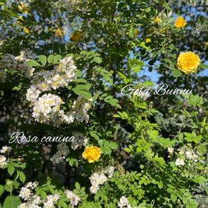 1.ゴールドバニー と零れ種ででて来た多分イヌバラ 2.手前ジャンジオノのバックにゴールドバニーとノイバラが🤍💛 2枚目の左上の銅葉はスモークツリーのベルベットクロークの葉です 🏷️金曜ローズショー