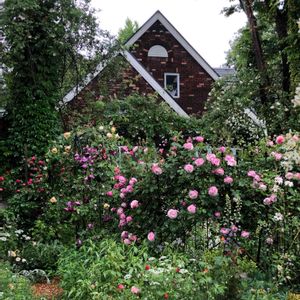 勝手口からの小さな景色♡ ごちゃごちゃして見えます(⑉・̆-・̆⑉)੭ 勝手口を出て 庭より一段高い場所から見た小さな景色です。 庭作りの際、ここから眺めては思案を巡らせていました( *^艸^) 奥の赤いバラはレッド・レオナルド。 隣の白はサマースノーのアーチ。 中程で目立っているクレマはコンテスド・ブーショー等々です。