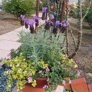 5/3撮影 ご近所のバラの庭の寄せ植えです。ラベンダー以外の名前は分かりません。すっきりとまとまった寄せ植えです。