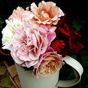 今日のマイガーデン💕 バラの花がだいぶ咲いてきました♪ 手前から ERウィンチェスターキャシドラル オルラヤレースフラワー ビサンテネールドゥギヨ アグロステンマ ERシンベリン やっぱり赤が目立ちますね