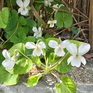 石垣の上、歩道に向いて花を咲かせる白いスミレ。 柱頭は棒状、距は薄紫。 AIがニオイスミレと教えてくれました。