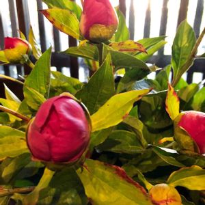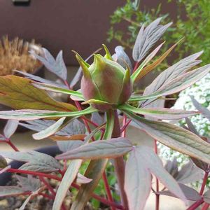 芍薬(シャクヤク)蕾がだいぶ膨らみました。 蕾の時にミツが出ますよね!舐めたら甘かったです😆❣️